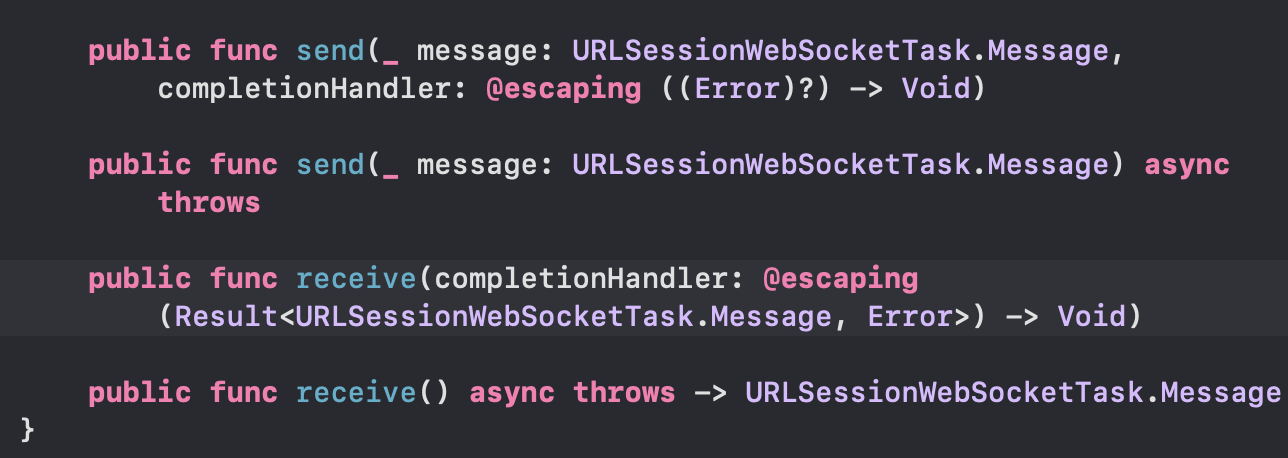 다시 WebSocket으로 돌아와서, Apple에서는 HTTP 통신을 URLSession을 권장하고 있는데 이번 iOS13에서 WebSocketTask를 추가했다.