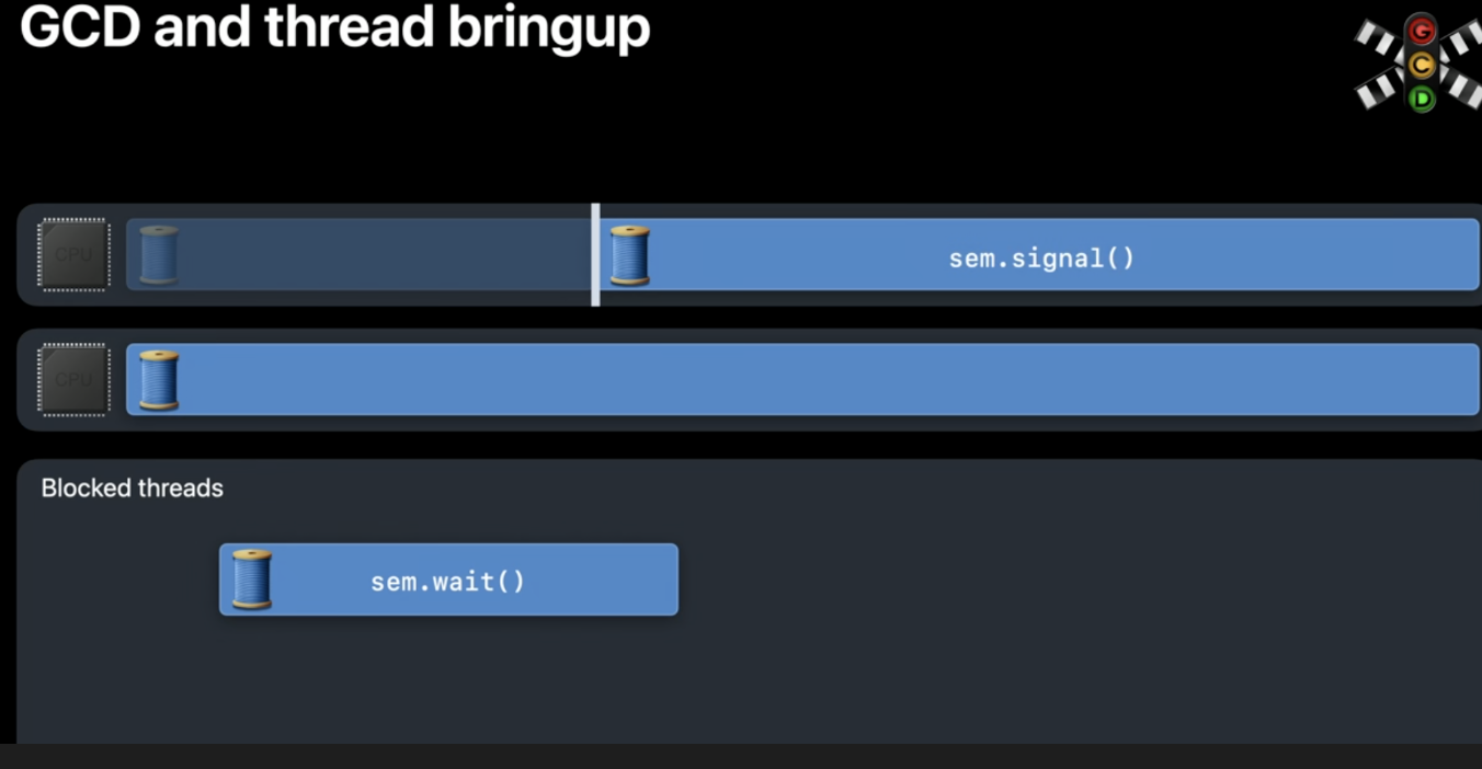 GCD는 위와 같이 Thread 채로 block한다. 따라서 concurrent한 작업량이 많은 경우, 작업 수만큼 Thread가 늘어날 수 있다.