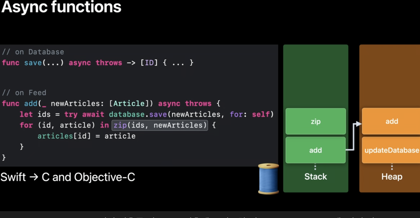 - local variable을 stack frame에 저장한다. await을 만나면 heap에 frame을 저장한다. 이 때는 suspension point를 넘나들 필요한 정보들을 저장한다.